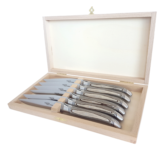 Coffret de 6 couteaux de table "LAGUIOLE", intégralement forgé, finition manche paperstone noir, un matériau écoresponsable très résistant.