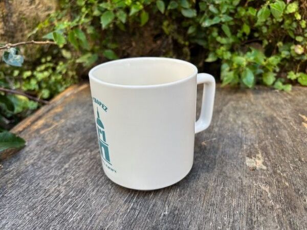 Mug en grès blanc empilable, décoré du Clocher de Saint-Tropez et des coordonnées GPS du village.