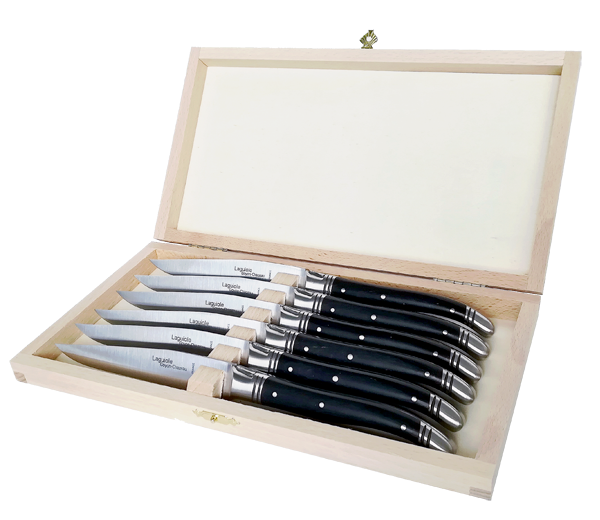 Coffret de 6 couteaux de table "LAGUIOLE", intégralement forgé, finition manche paperstone noir, un matériau écoresponsable très résistant.